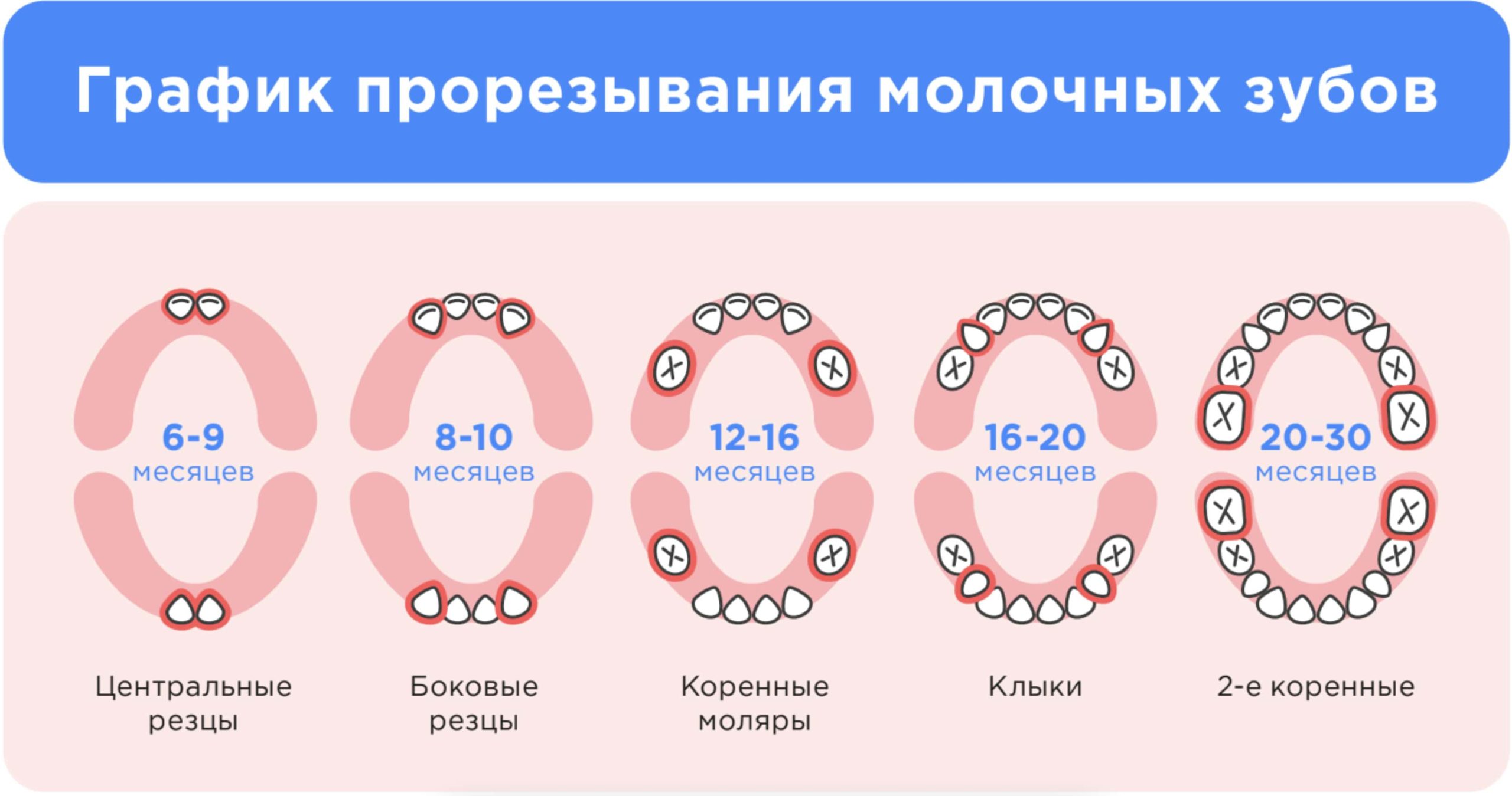 - 6-7 месяцев: Прорезываются моляры (которых не было в молочном прикусе).